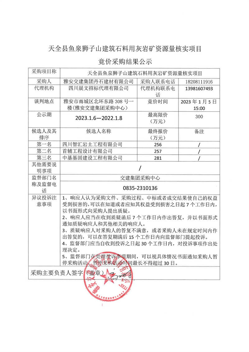 雅安交建集團丹石建材有限公司天全縣魚泉獅子山建筑石料用灰?guī)r礦資源量核實項目競價采購結果公示