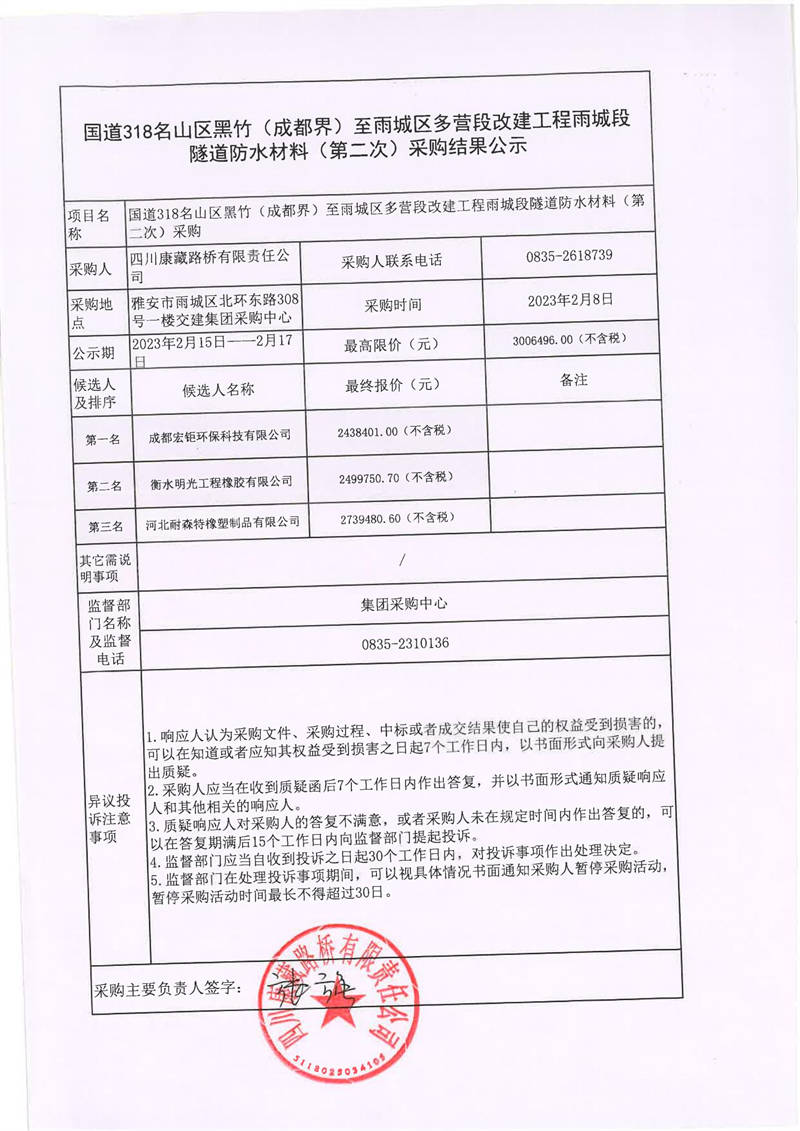 四川康藏路橋有限責(zé)任公司國(guó)道318線名山區(qū)黑竹(成都界)至雨城區(qū)多營(yíng)段改建工程雨城段隧道防水材料(第二次)采購(gòu)