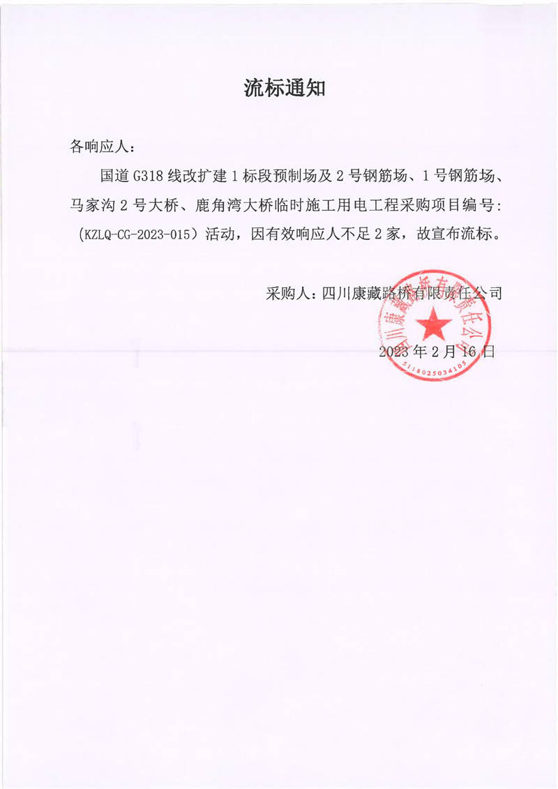 四川康藏路橋有限責(zé)任公司國道G318線改擴(kuò)建1標(biāo)段預(yù)制場及2號鋼筋場、1號鋼筋場、馬家溝2號大橋、鹿角灣大橋臨時(shí)施工用電工程采購項(xiàng)目流標(biāo)通知
