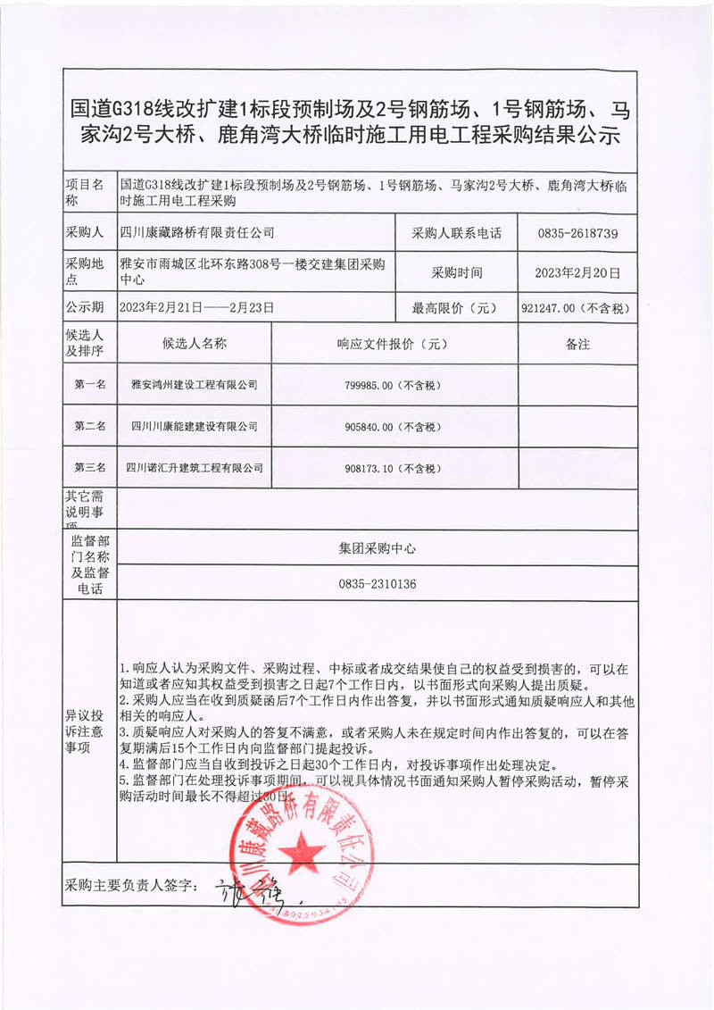 四川康藏路橋有限責(zé)任公司國道318線改擴(kuò)建1標(biāo)段預(yù)制場(chǎng)及2號(hào)鋼筋場(chǎng)、1號(hào)鋼筋場(chǎng)、馬家溝2號(hào)大橋、鹿角灣大橋臨時(shí)施工用電工程采購結(jié)果公示