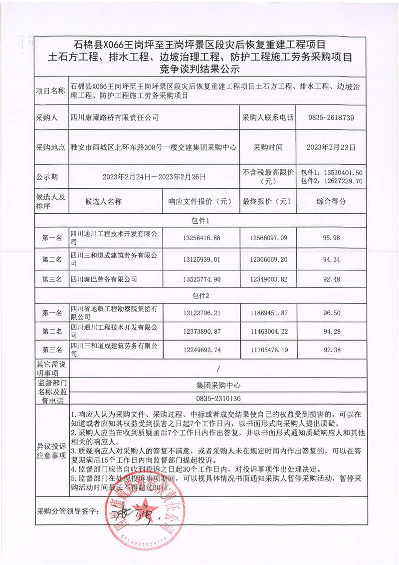 四川康藏路橋有限責(zé)任公司石棉縣X066王崗坪至王崗坪景區(qū)段災(zāi)后恢復(fù)重建工程項(xiàng)目土石方工程、排水工程、邊坡治理工程、防護(hù)工程施工勞務(wù)采購(gòu)項(xiàng)目競(jìng)爭(zhēng)談判結(jié)果公示