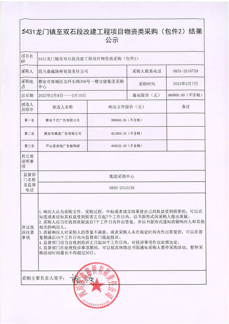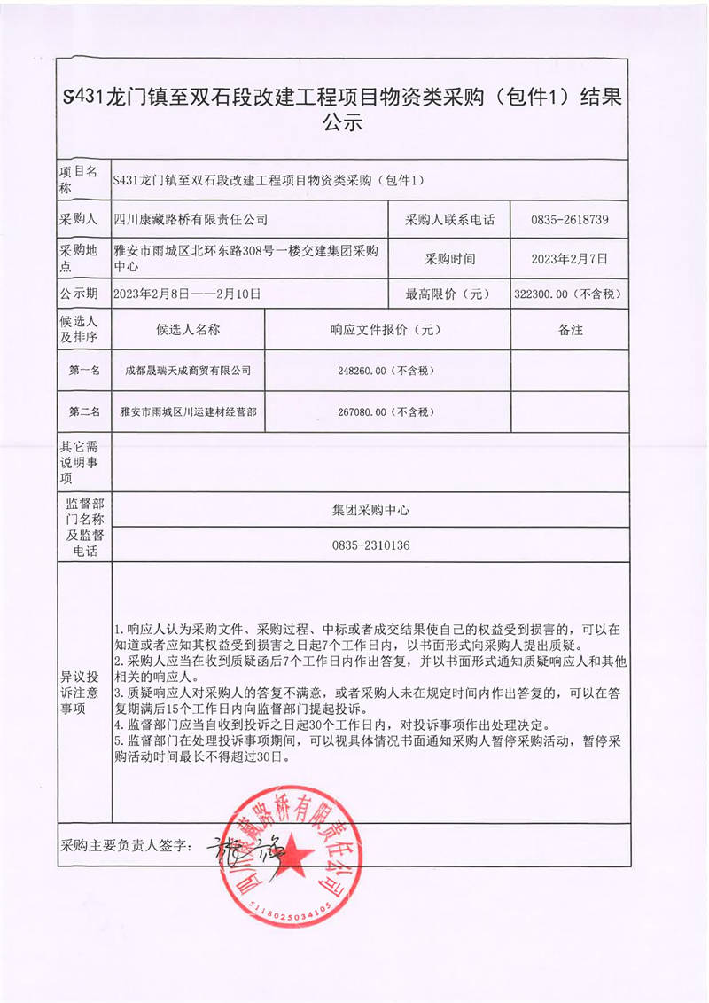 四川康藏路橋有限責任公司S431龍門鎮(zhèn)至雙石段改建工程項目物資類采購(包件1、包件2)結果公示