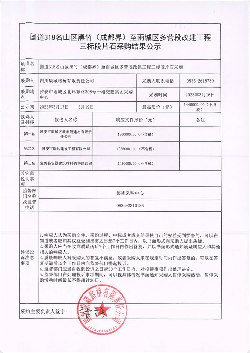 四川康藏路橋有限責任公司國道318名山區(qū)黑竹(成都界)至雨城區(qū)多營段改建工程三標段片石采購結果公示