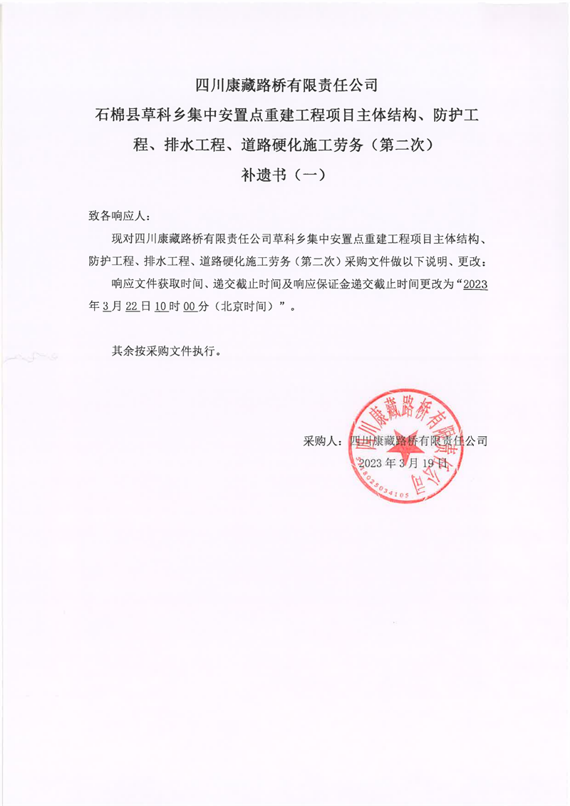 四川康藏路橋有限責任公司石棉縣草科鄉(xiāng)集中安置點重建工程項目主體結構、防護工程、排水工程、道路硬化施工勞務(第二次)補遺書(一)