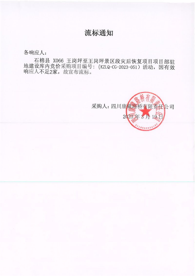 四川康藏路橋有限責(zé)任公司石棉縣X066王崗坪至王崗坪景區(qū)段災(zāi)后恢復(fù)項(xiàng)目項(xiàng)目部駐地建設(shè)庫內(nèi)競價(jià)采購流標(biāo)通知
