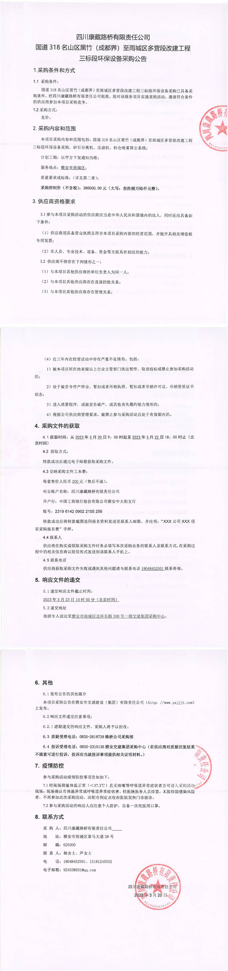 四川康藏路橋有限責(zé)任公司國(guó)道318名山區(qū)黑竹(成都界)至雨城區(qū)多營(yíng)段改建工程三標(biāo)段環(huán)保設(shè)備采購(gòu)公告