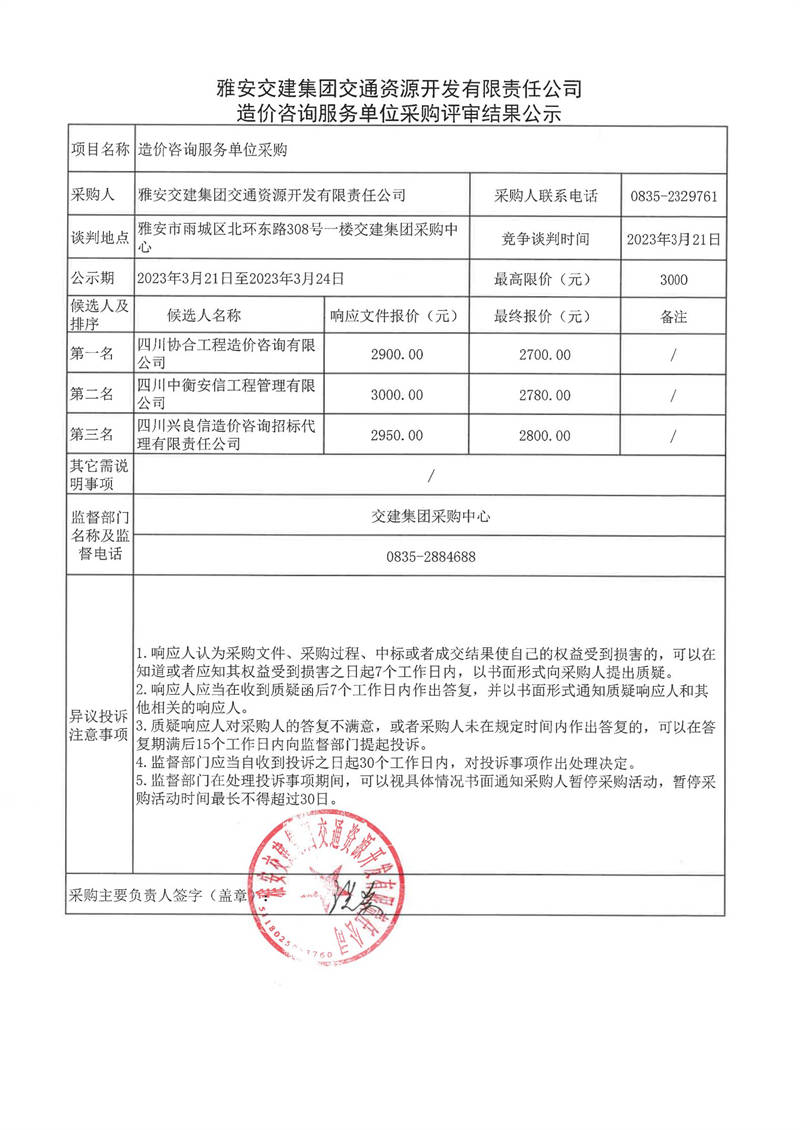 雅安交建集團(tuán)交通資源開發(fā)有限責(zé)任公司造價(jià)咨詢服務(wù)單位采購評(píng)審結(jié)果公示
