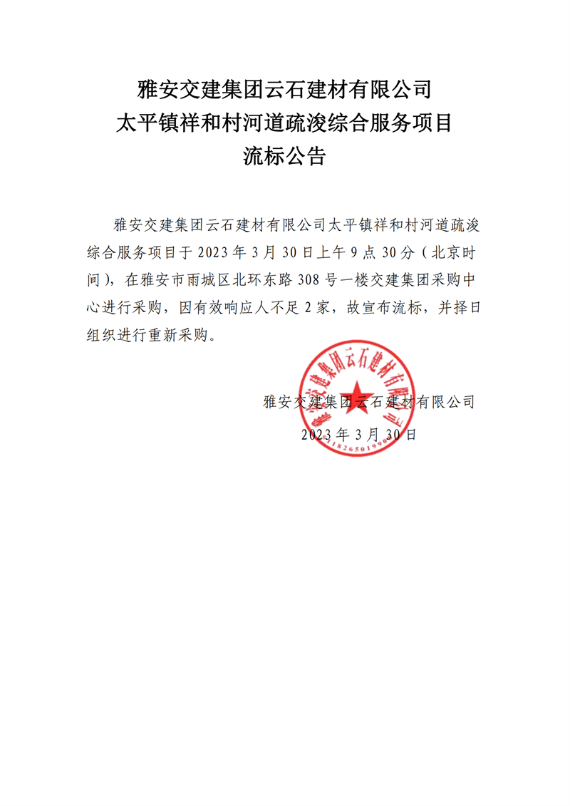 雅安交建集團(tuán)云石建材有限公司太平鎮(zhèn)祥和村河道疏浚綜合服務(wù)項目流標(biāo)通知