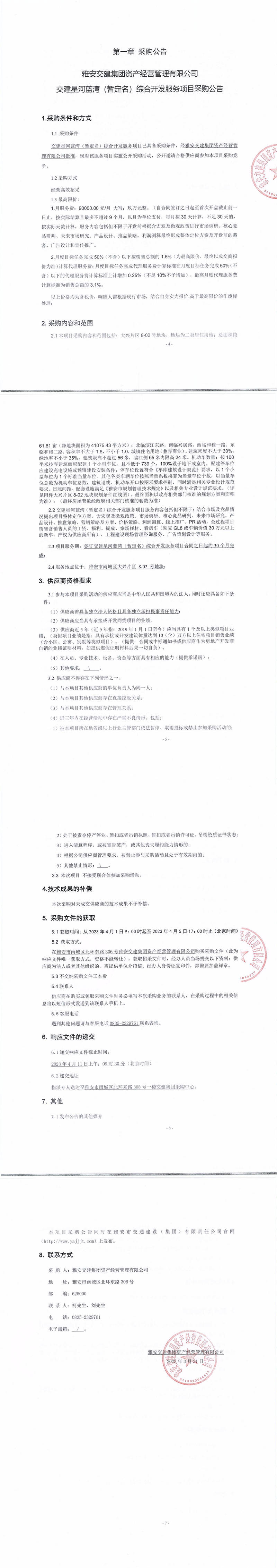 雅安交建集團(tuán)資產(chǎn)經(jīng)營(yíng)管理有限公司交建星河藍(lán)灣(暫定名)綜合開(kāi)發(fā)服務(wù)項(xiàng)目采購(gòu)公告
