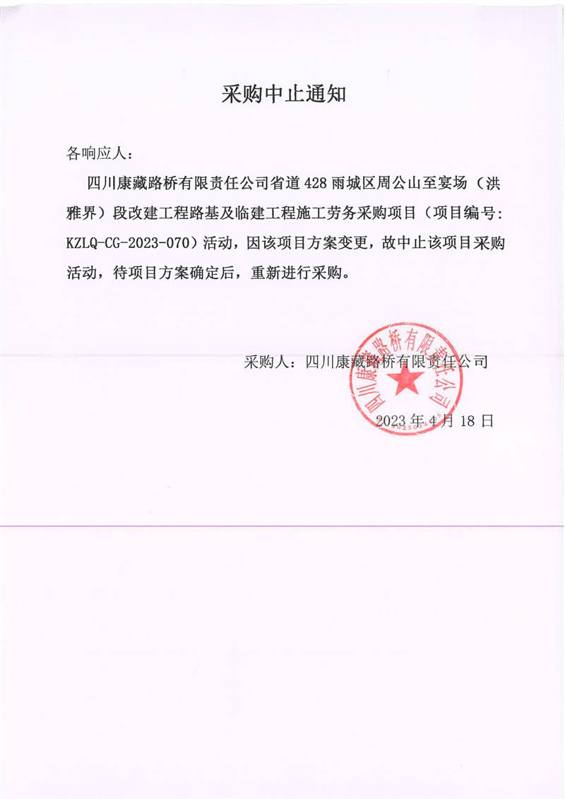 四川康藏路橋有限責(zé)任公司省道428雨城區(qū)周公山至宴場(洪雅界)段改建工程路基及臨建工程施工勞務(wù)采購項(xiàng)目采購中止通知