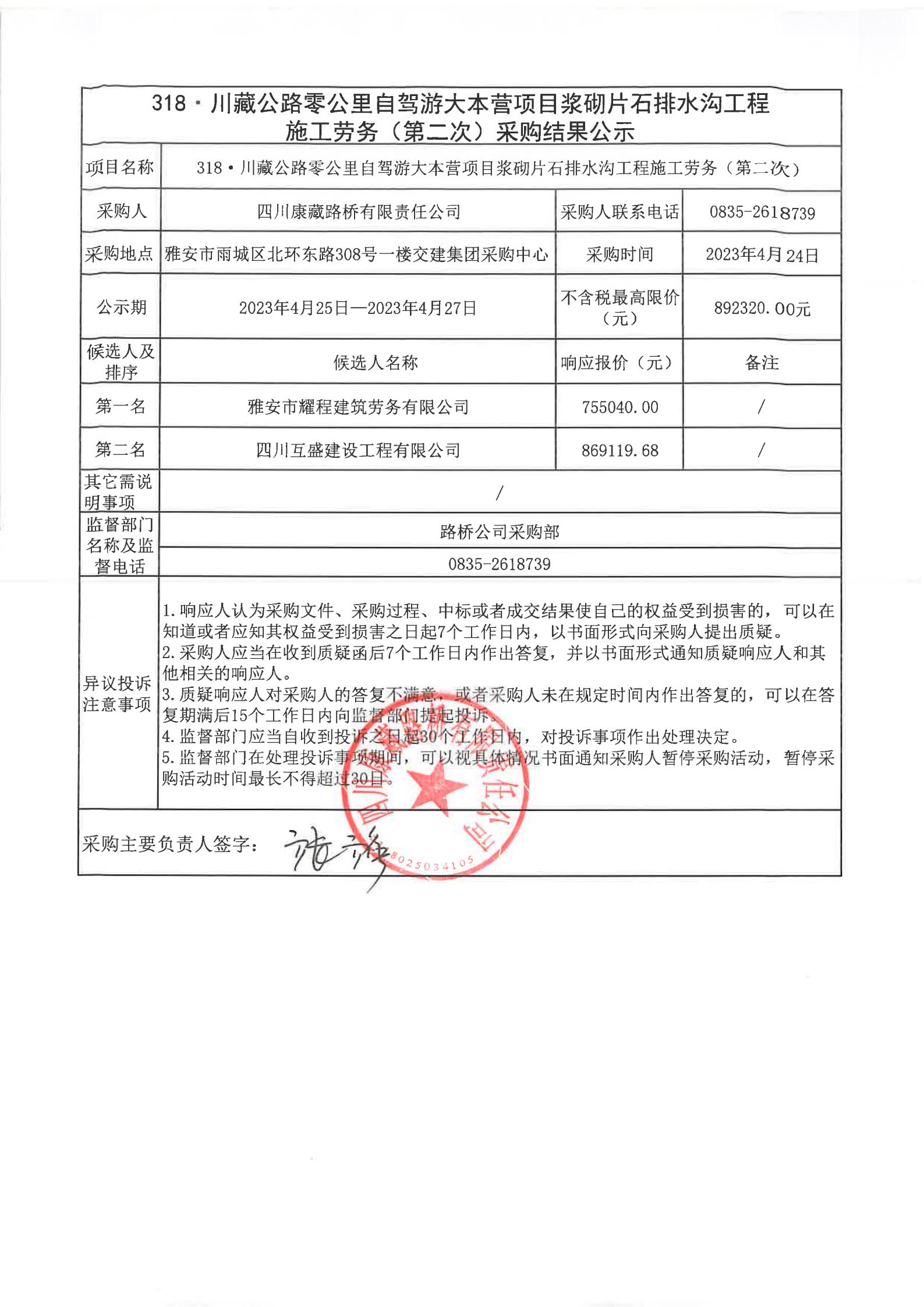 四川康藏路橋有限責(zé)任公司318·川藏公路零公里自駕游大本營(yíng)項(xiàng)目漿砌片石排水溝工程施工勞務(wù)(第二次)采購結(jié)果公示