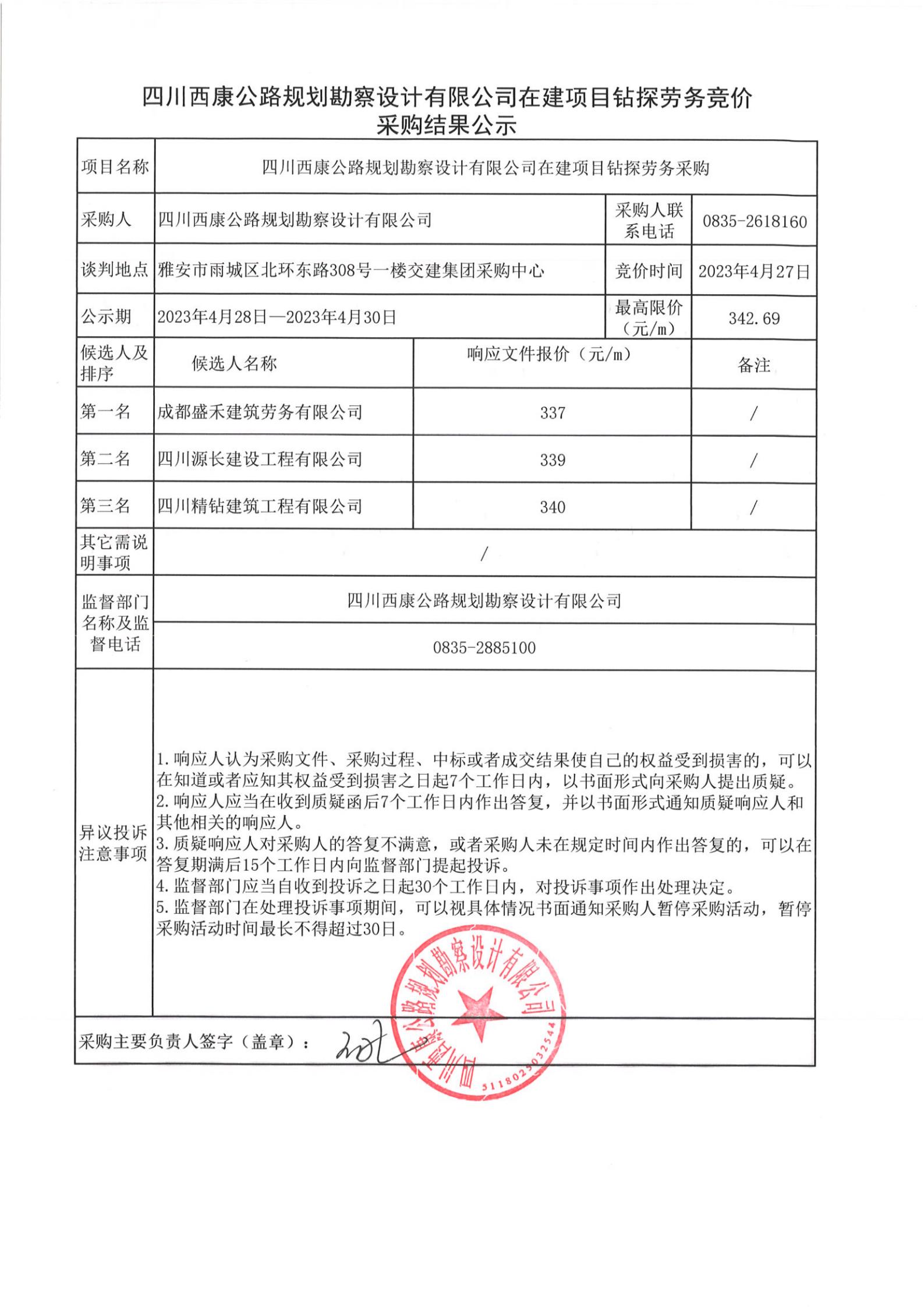 四川西康公路規(guī)劃勘察設(shè)計(jì)公司在建項(xiàng)目鉆探勞務(wù)競(jìng)價(jià)采購(gòu)結(jié)果公示