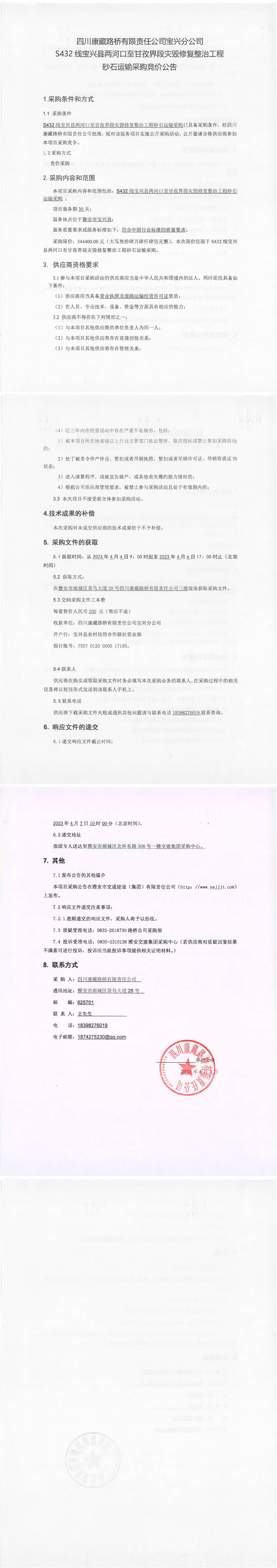 四川康藏路橋有限責任公司寶興分公司S432寶興縣兩河口至甘孜界段災毀修復整治工程砂石運輸采購競價公告