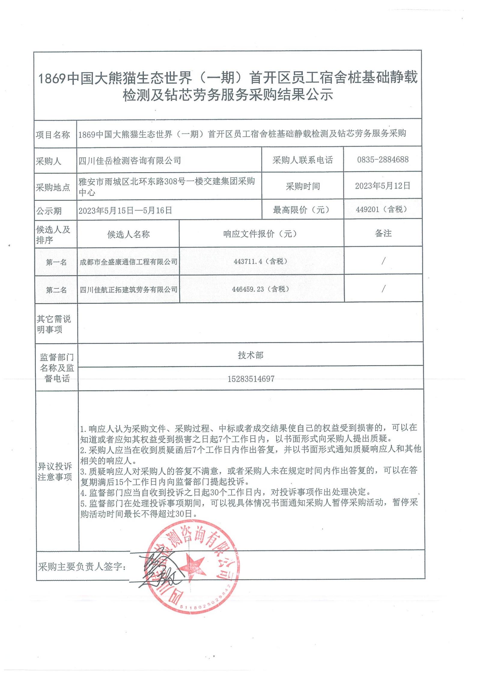 四川佳岳檢測咨詢有限公司關于1869中國大熊貓生態(tài)世界(一期)首開區(qū)員工宿舍樁基礎靜載檢測勞務及鉆芯項目中標結(jié)果公示