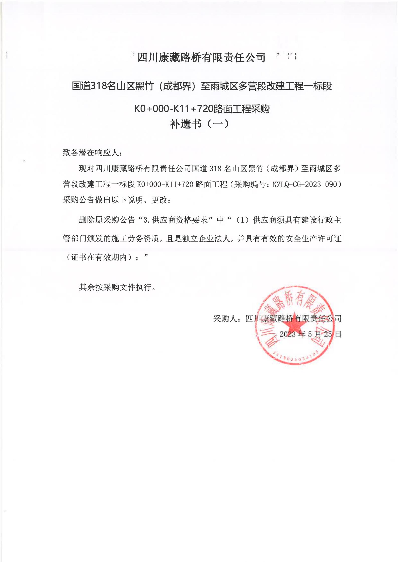 四川康藏路橋有限責(zé)任公司國道318名山區(qū)黑竹(成都界)至雨城區(qū)多營段改建工程一標(biāo)段K0+000-K11+720路面工程采購補遺書(一)