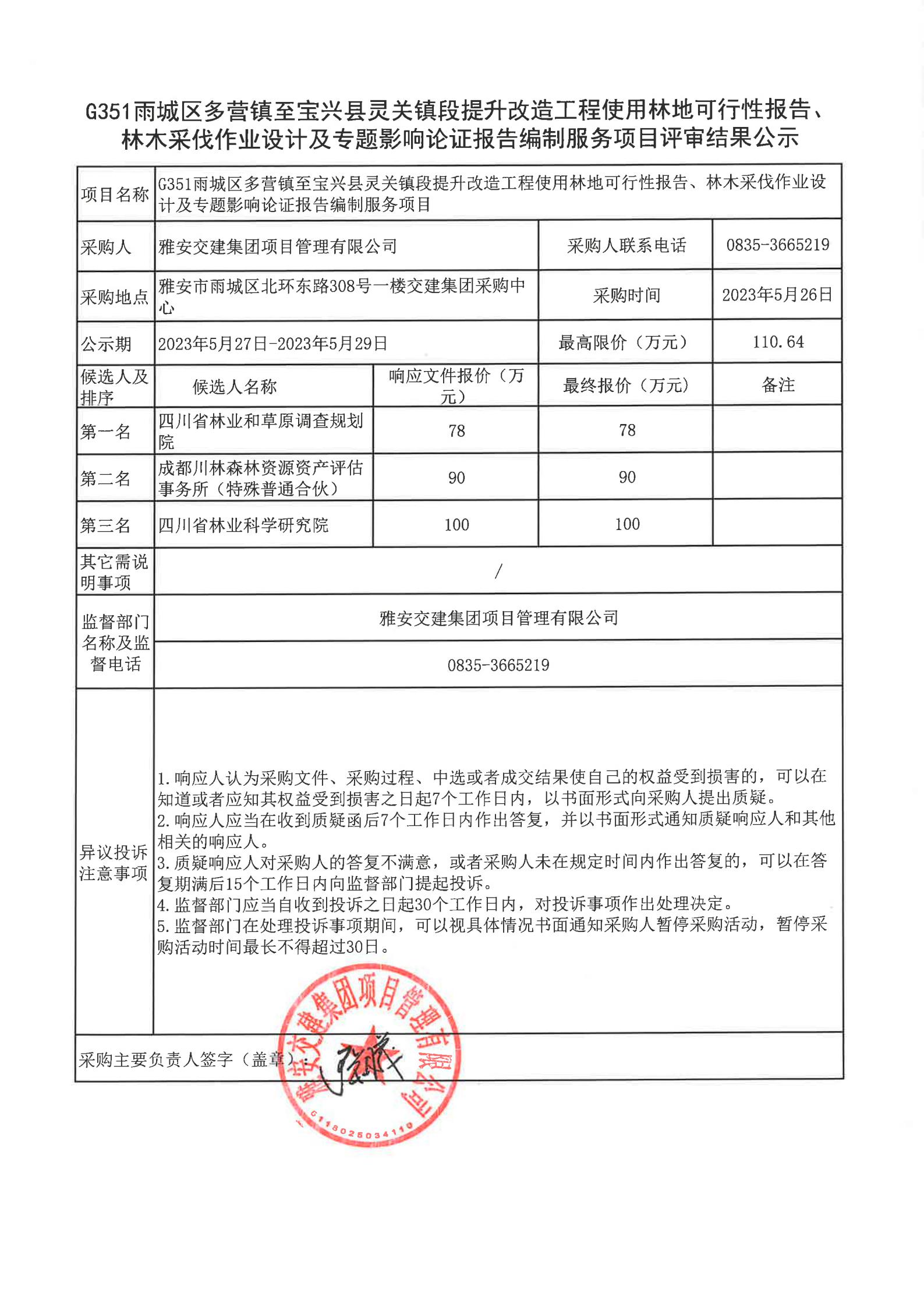雅安交建集團項目管理有限公司G351雨城區(qū)多營鎮(zhèn)至寶興縣靈關(guān)鎮(zhèn)段提升改造工程使用林地可行性報告、林木采伐作業(yè)設計及專題影響論證報告編制服務項目評審結(jié)果公示