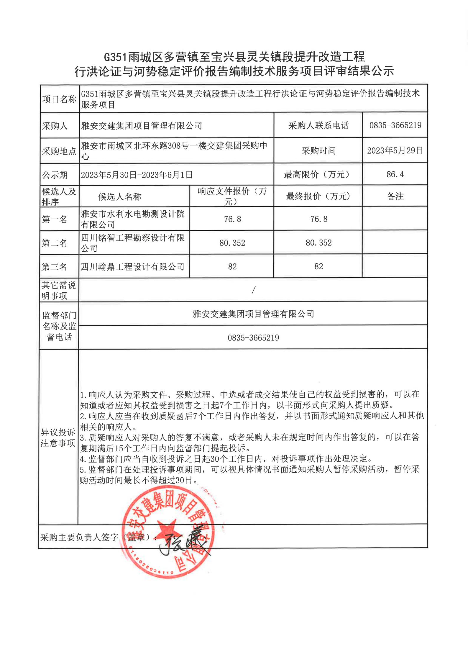 雅安交建集團項目管理有限公司G351雨城區(qū)多營鎮(zhèn)至寶興縣靈關鎮(zhèn)段提升改造工程行洪論證與河勢穩(wěn)定評價報告編制技術服務項目評審結(jié)果公示