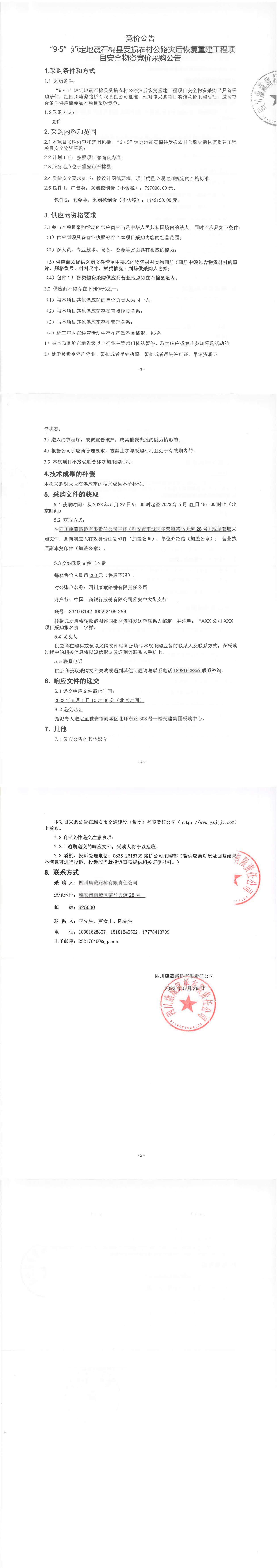 四川康藏路橋有限責(zé)任公司“9.5”瀘定地震石棉縣受損農(nóng)村公路災(zāi)后恢復(fù)重建工程項(xiàng)目安全物資競價采購公告