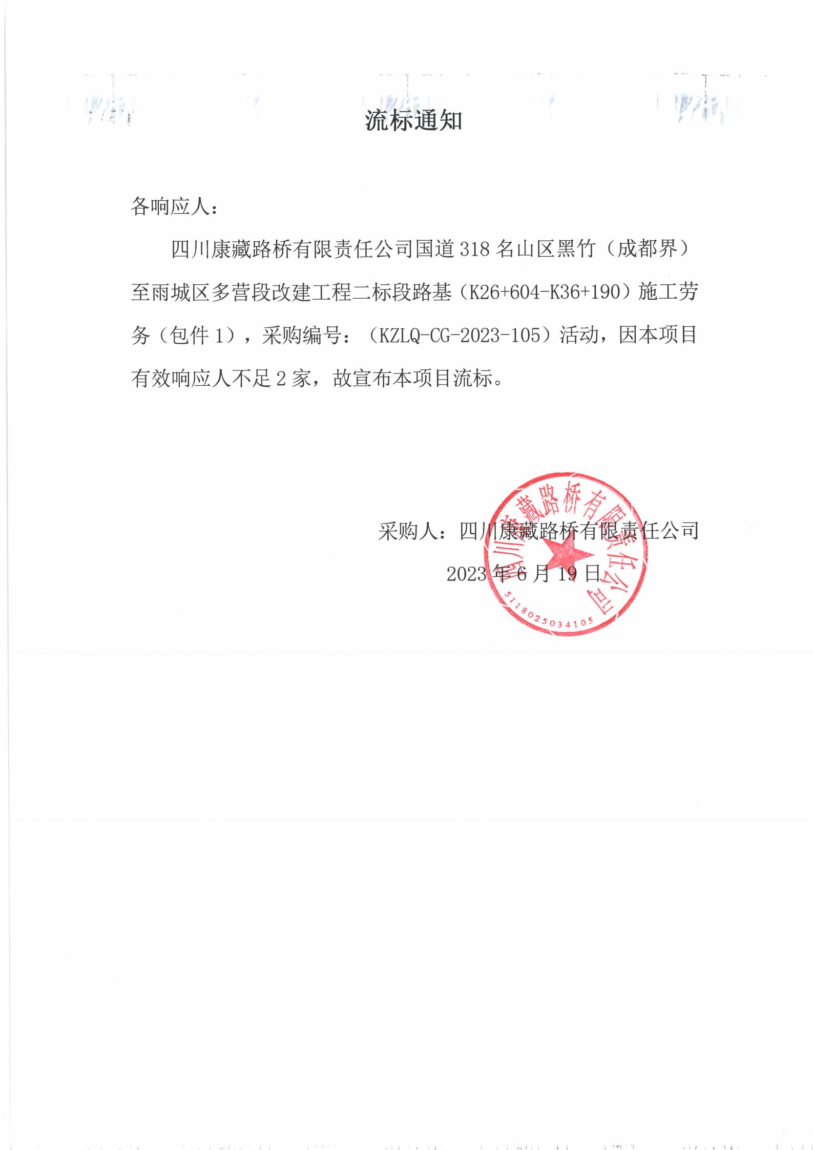 四川康藏路橋有限責(zé)任公司國(guó)道318名山區(qū)黑竹(成都界)至雨城區(qū)多營(yíng)段改建工程二標(biāo)段路基(K26+604-K36+190)施工勞務(wù)采購(包件1)流標(biāo)通知