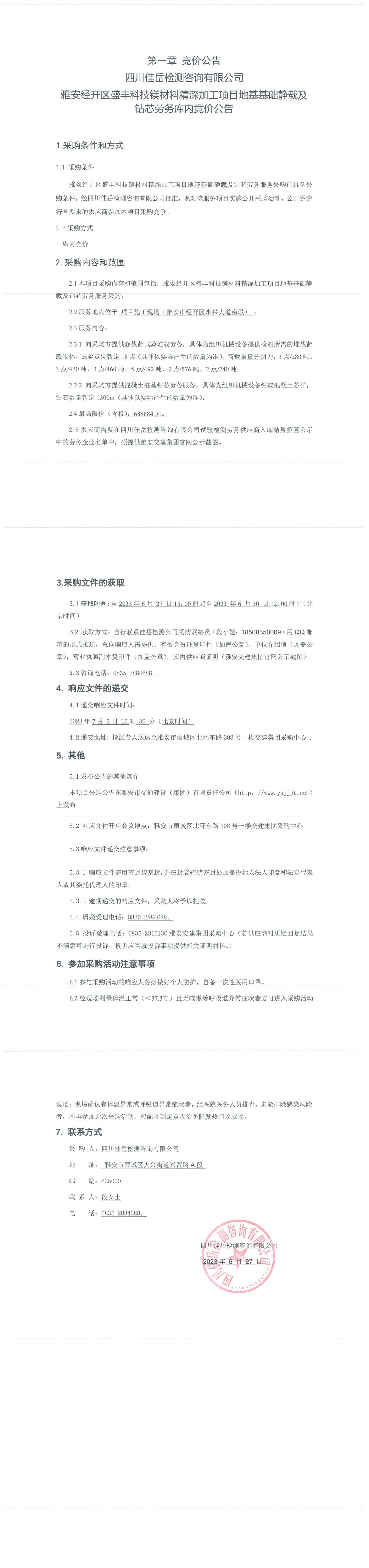 四川佳岳檢測(cè)咨詢有限公司雅安經(jīng)開(kāi)區(qū)盛豐科技鎂材料精深加工項(xiàng)目地基基礎(chǔ)靜載及鉆芯勞務(wù)庫(kù)內(nèi)競(jìng)價(jià)公告