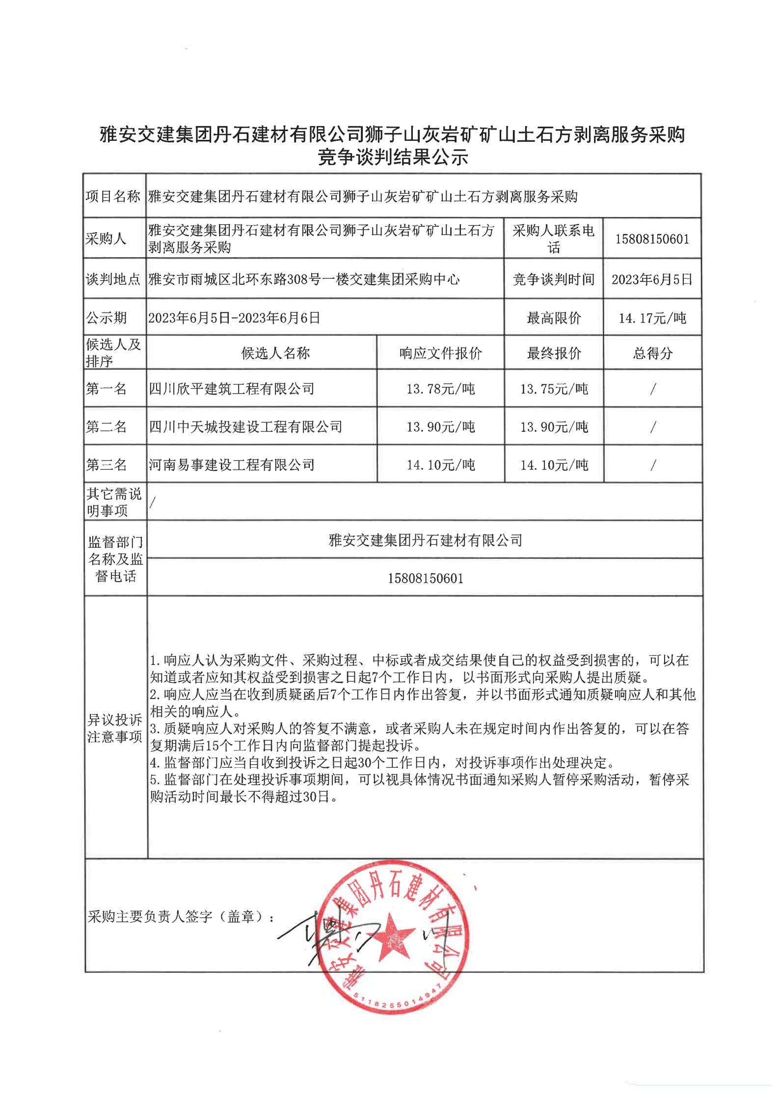 雅安交建集團(tuán)丹石建材有限公司獅子山灰?guī)r礦礦山土石方剝離服務(wù)采購競爭談判結(jié)果公示