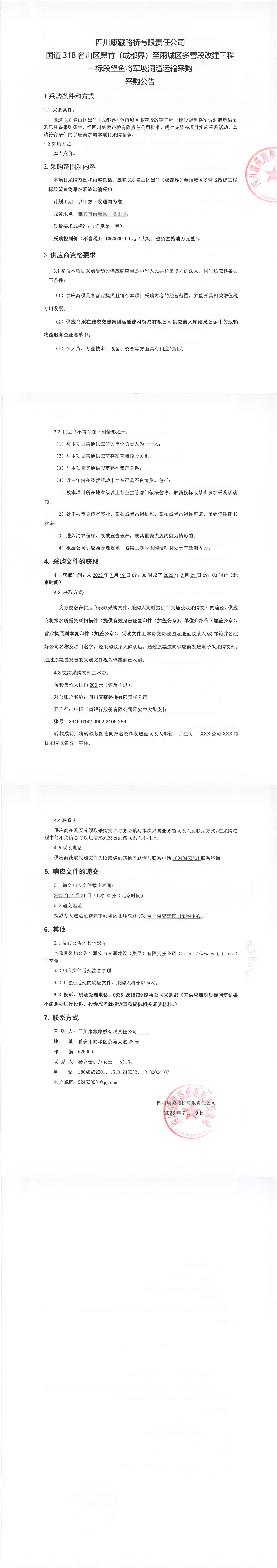 四川康藏路橋有限責(zé)任公司國(guó)道318名山區(qū)黑竹(成都界)至雨城區(qū)多營(yíng)段改建工程一標(biāo)段望魚(yú)將軍坡洞渣運(yùn)輸采購(gòu)公告