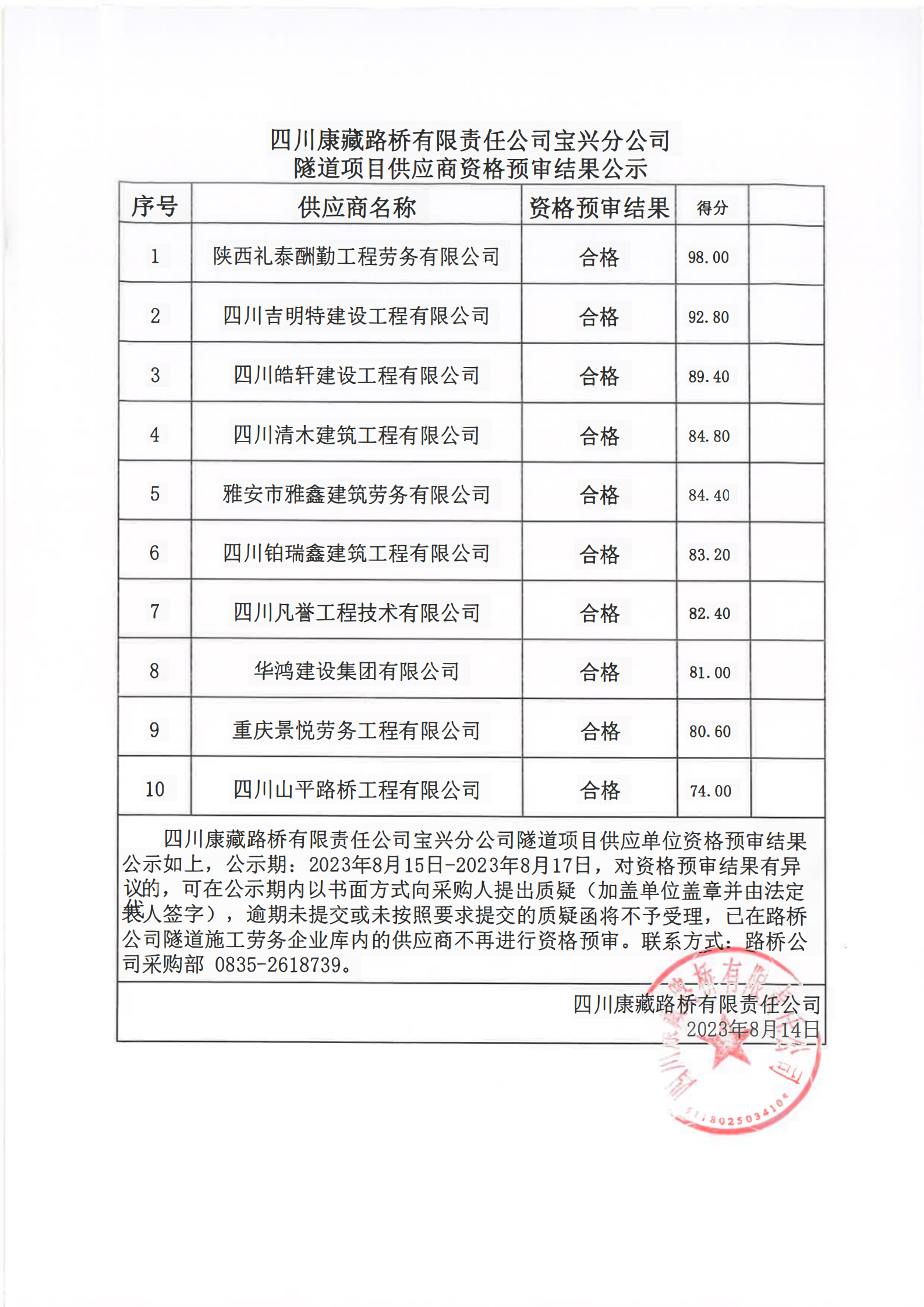 四川康藏路橋有限責任公司寶興分公司隧道項目供應商資格預審結(jié)果公示