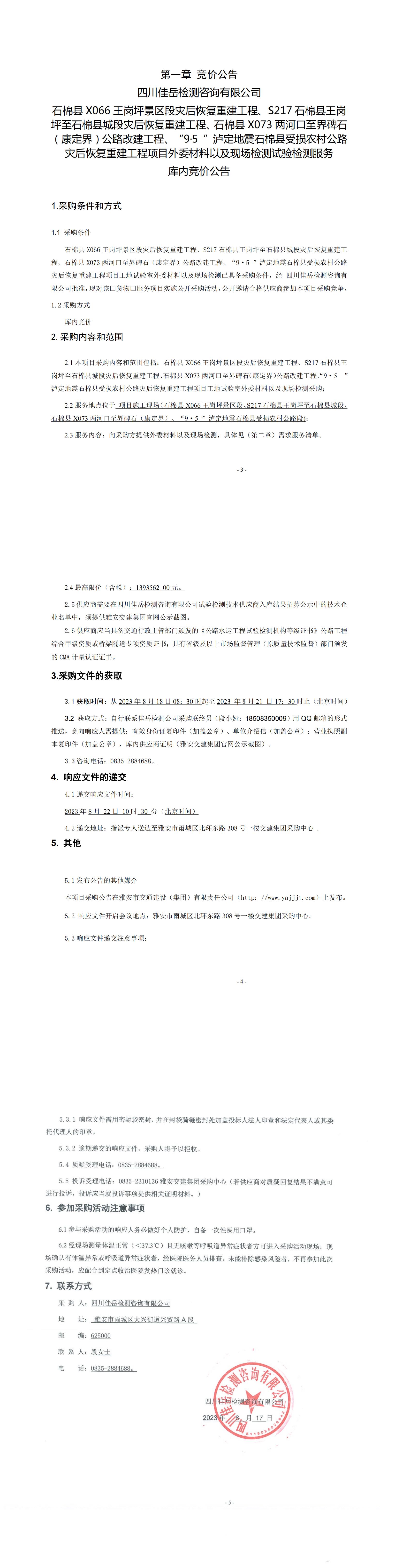 四川佳岳檢測咨詢有限公司石棉縣X066王崗坪至王崗坪景區(qū)段災(zāi)后恢復(fù)重建工程、S217石棉縣王崗坪至石棉縣城段災(zāi)后恢復(fù)重建工程、石棉縣X073兩河口至界碑石(康定界)公路改建工程、“9·5”瀘定地震石棉縣受損農(nóng)村公路災(zāi)后恢復(fù)重建工程項(xiàng)目外委材料以及現(xiàn)場檢測試驗(yàn)檢測服務(wù)庫內(nèi)競價(jià)公告