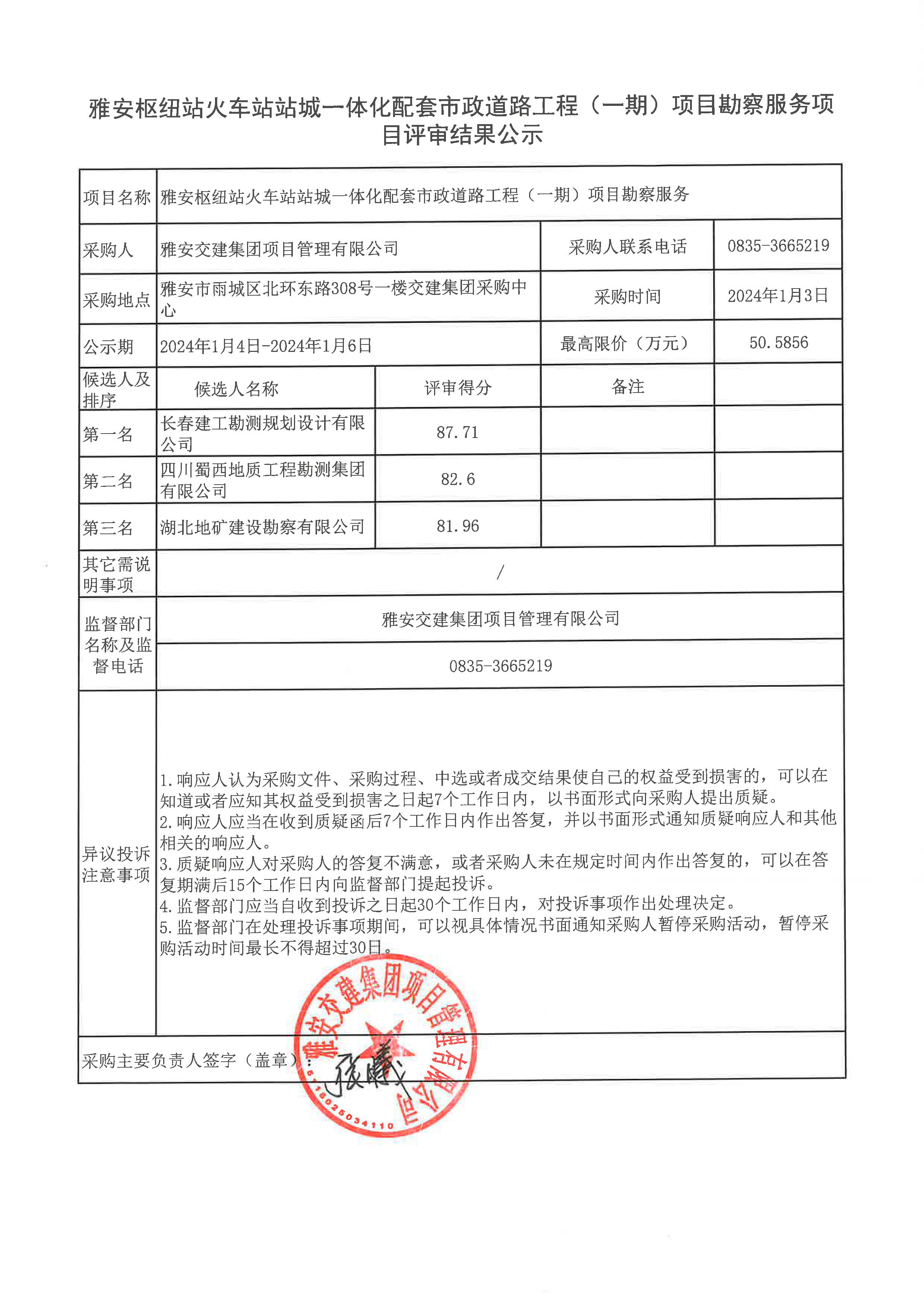 雅安交建集團項目管理有限公司雅安樞紐站火車站站城一體化配套市政道路工程(一期) 項目勘察服務項目評審結果公示
