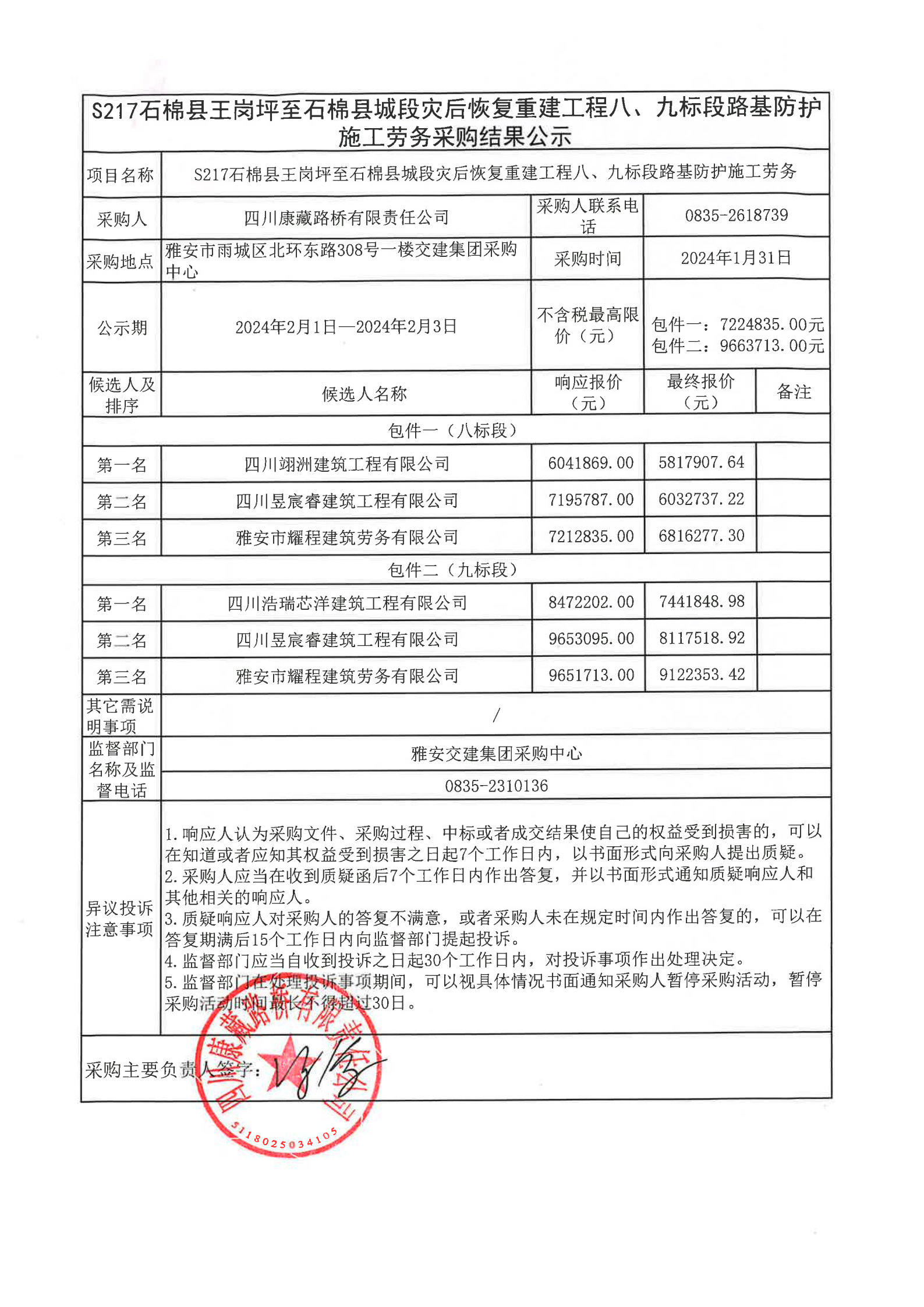 四川康藏路橋有限責(zé)任公司S217石棉縣王崗坪至石棉縣城段災(zāi)后恢復(fù)重建工程八、九標(biāo)段路基防護(hù)施工勞務(wù)采購(gòu)結(jié)果公示