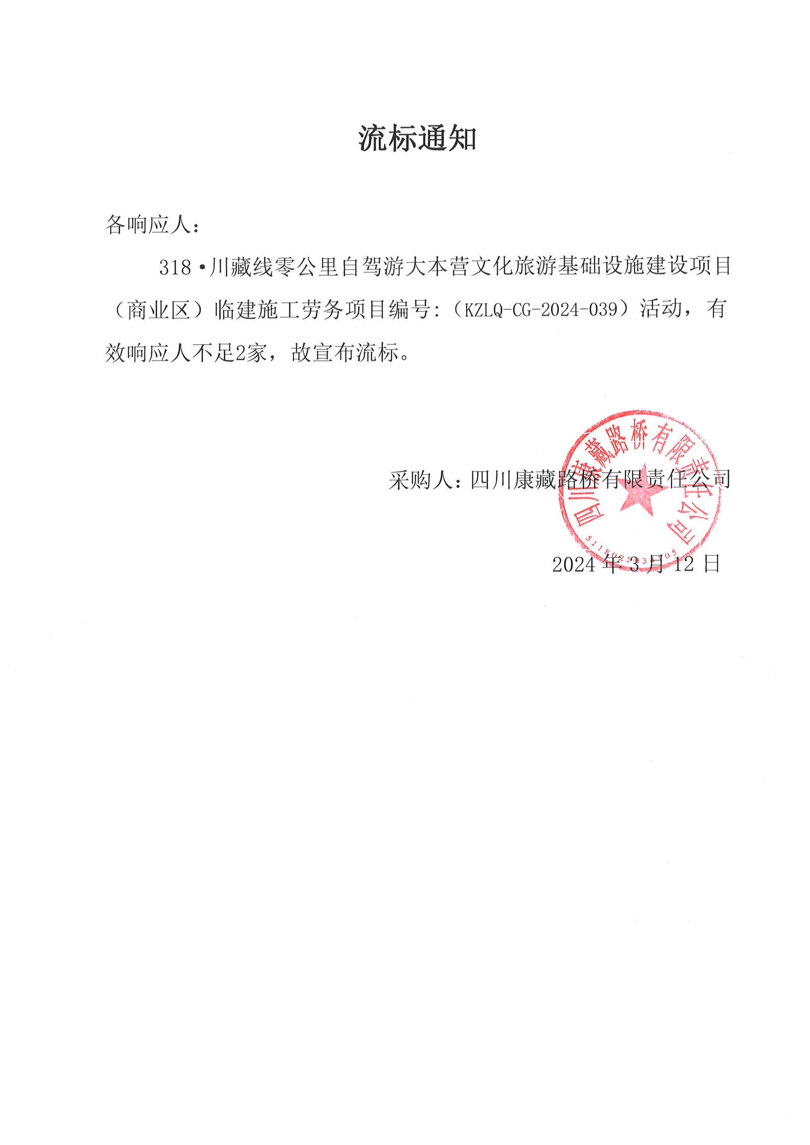 四川康藏路橋有限責(zé)任公司318·川藏線零公里自駕游大本營文化旅游基礎(chǔ)設(shè)施建設(shè)項(xiàng)目(商業(yè)區(qū))臨建施工勞務(wù)流標(biāo)通知