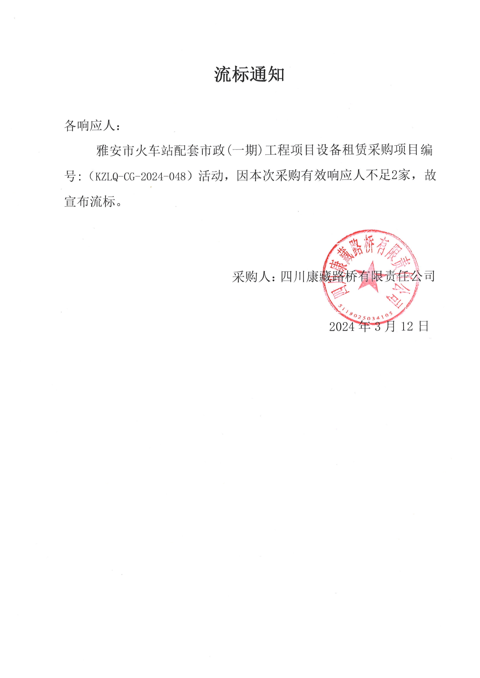四川康藏路橋有限責任公司雅安市火車站配套市政(一期)工程項目設(shè)備租賃采購流標通知