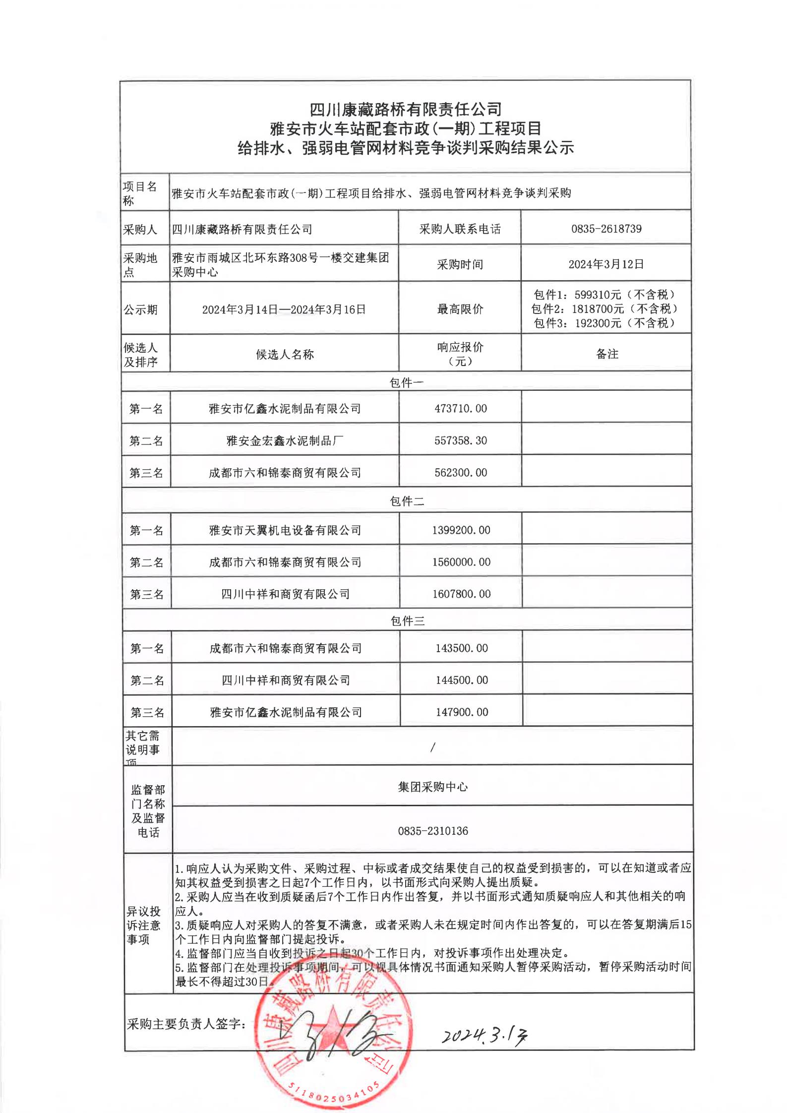 四川康藏路橋有限責(zé)任公司雅安市火車站配套市政(一期)工程項目給排水、強弱電管網(wǎng)材料采購結(jié)果公示