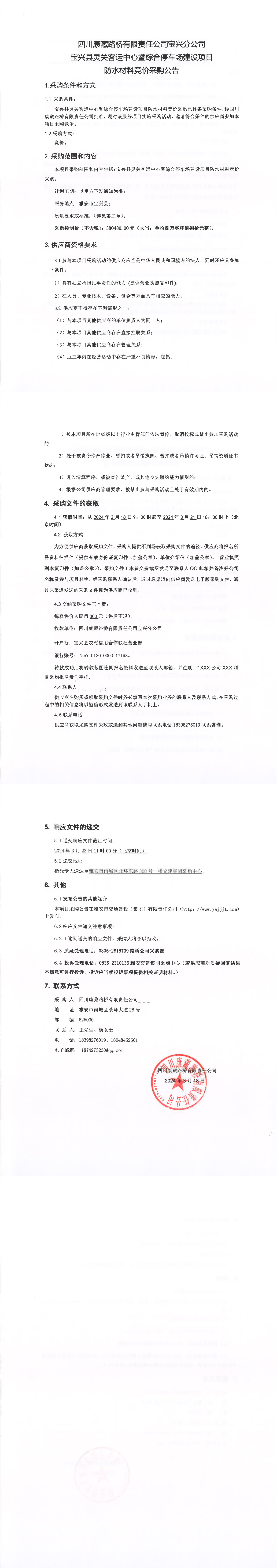 四川康藏路橋有限責(zé)任公司寶興縣靈關(guān)客運(yùn)中心暨綜合停車場建設(shè)項(xiàng)目防水材料競價采購公告