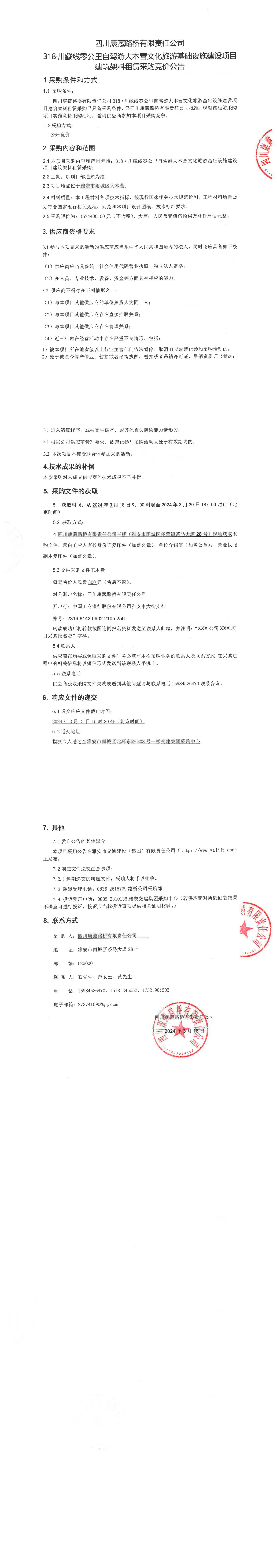 四川康藏路橋有限責(zé)任公司318·川藏線零公里自駕游大本營文化旅游基礎(chǔ)設(shè)施建設(shè)項(xiàng)目建筑架料采購公告