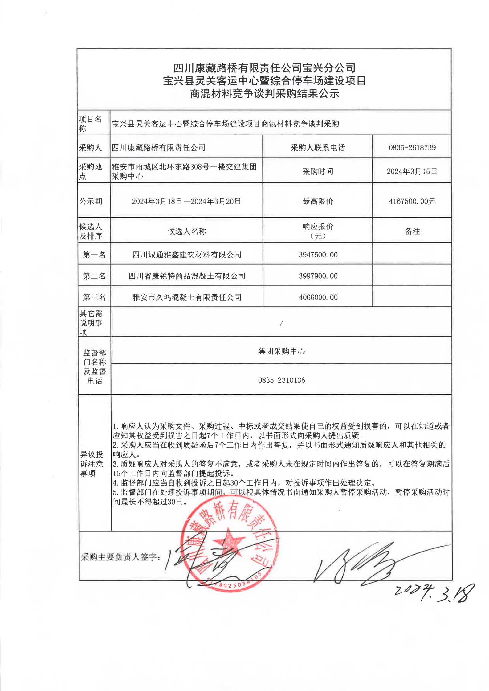 四川康藏路橋有限責(zé)任公司寶興分公司寶興縣靈關(guān)客運(yùn)中心暨綜合停車(chē)場(chǎng)建設(shè)項(xiàng)目商混材料競(jìng)爭(zhēng)談判采購(gòu)結(jié)果公示