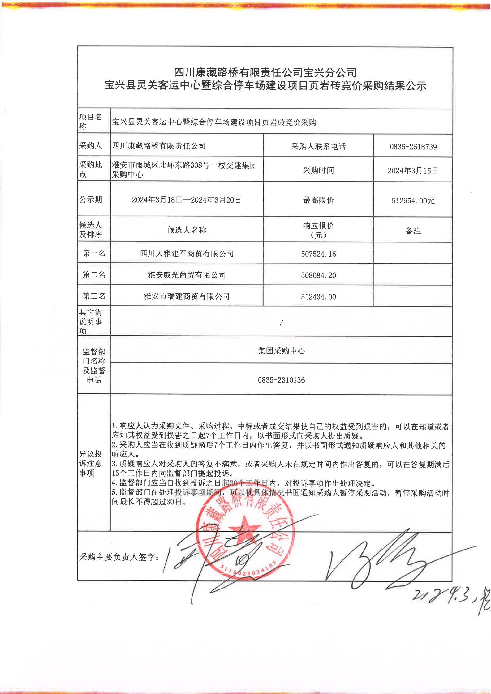 四川康藏路橋有限責(zé)任公司寶興分公司寶興縣靈關(guān)客運(yùn)中心暨綜合停車場建設(shè)項(xiàng)目頁巖磚競價采購結(jié)果公示