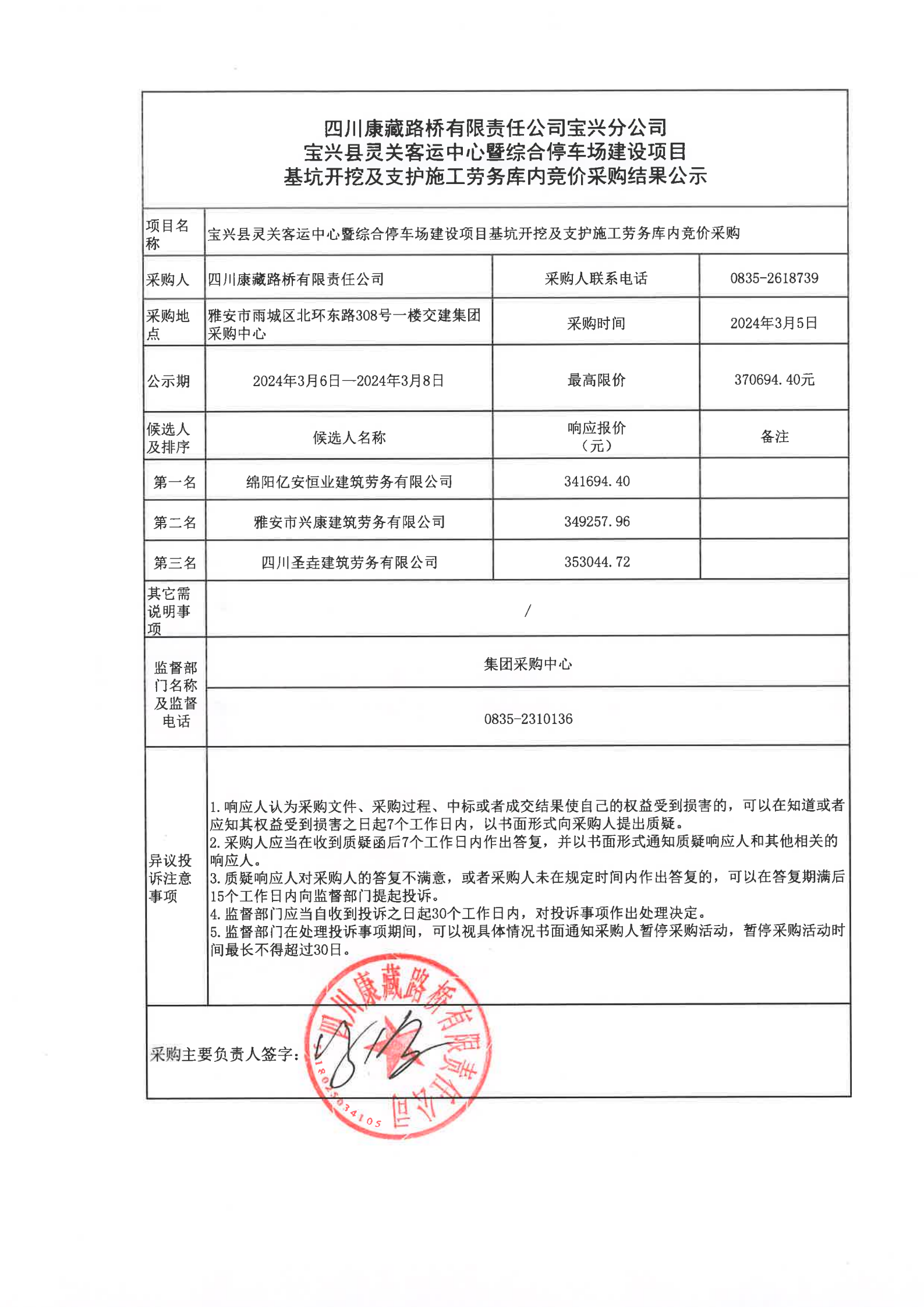 四川康藏路橋有限責(zé)任公司寶興分公司寶興縣靈關(guān)客運(yùn)中心暨綜合停車場建設(shè)項(xiàng)目基坑開挖及支護(hù)施工勞務(wù)庫內(nèi)競價(jià)采購結(jié)果公示