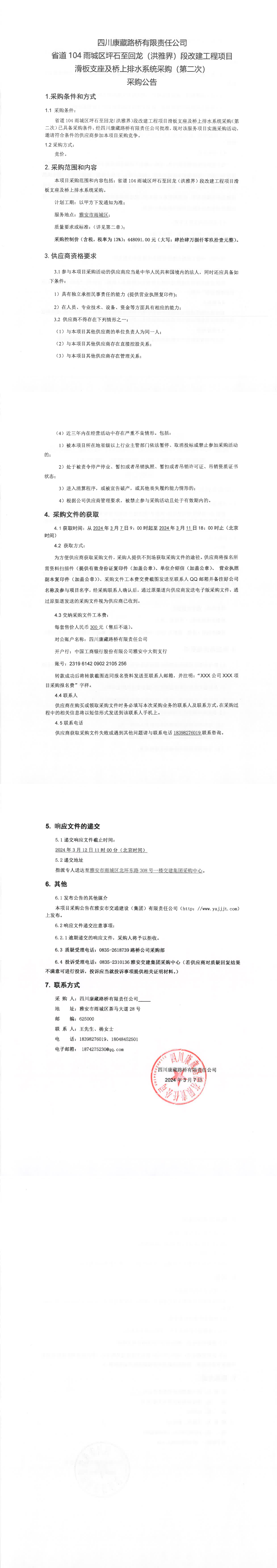 四川康藏路橋有限責(zé)任公司省道104雨城區(qū)坪石至回龍(洪雅界)段改建工程項(xiàng)目滑板支座及橋上排水系統(tǒng)流采購(gòu)標(biāo)通知