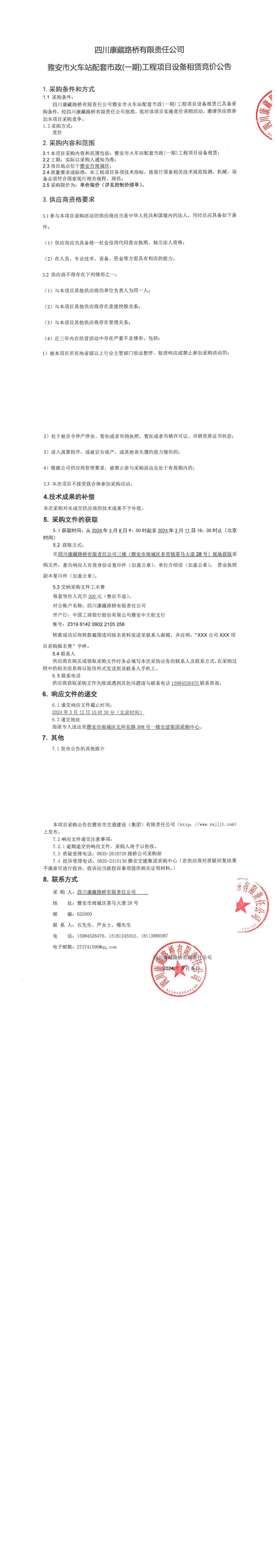 四川康藏路橋有限責(zé)任公司雅安市火車站配套市政(一期)工程項(xiàng)目設(shè)備租賃競價公告