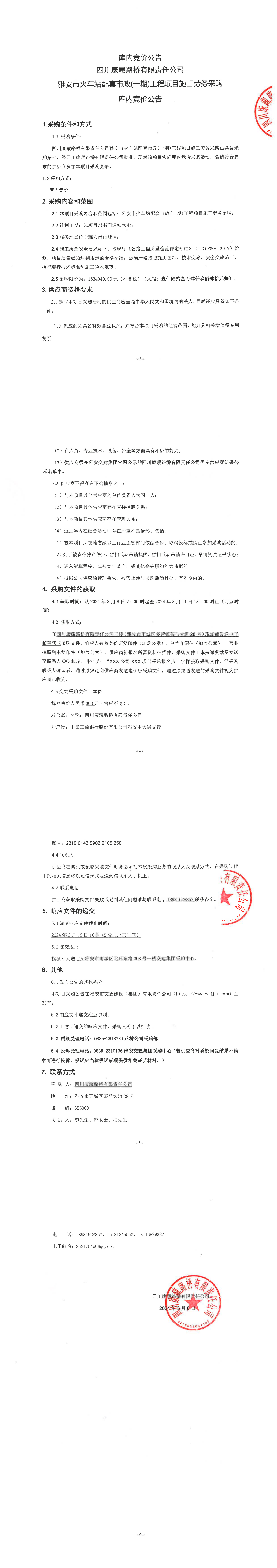四川康藏路橋有限責任公司雅安市火車站配套市政(一期)工程項目施工勞務采購庫內競價公告