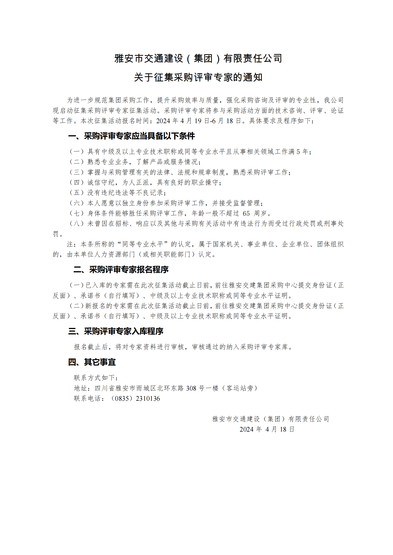 雅安市交通建設(shè)(集團(tuán))有限責(zé)任公司關(guān)于征集采購評(píng)審專家的通知