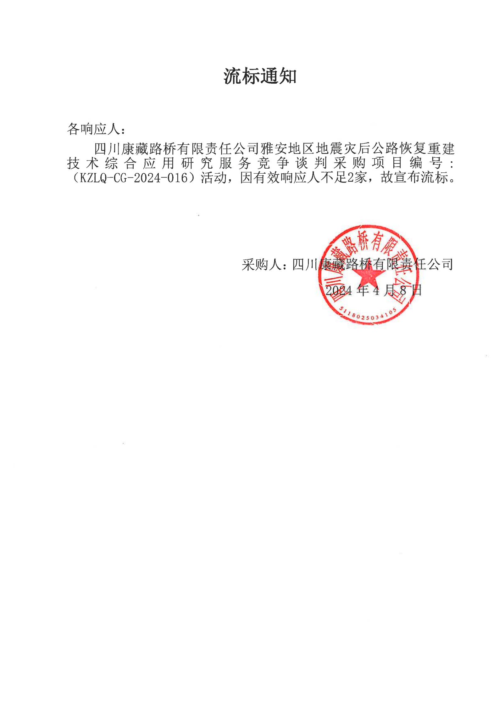 四川康藏路橋有限責任公司雅安地區(qū)地震災后公路恢復重建技術(shù)綜合應用研究服務流標通知