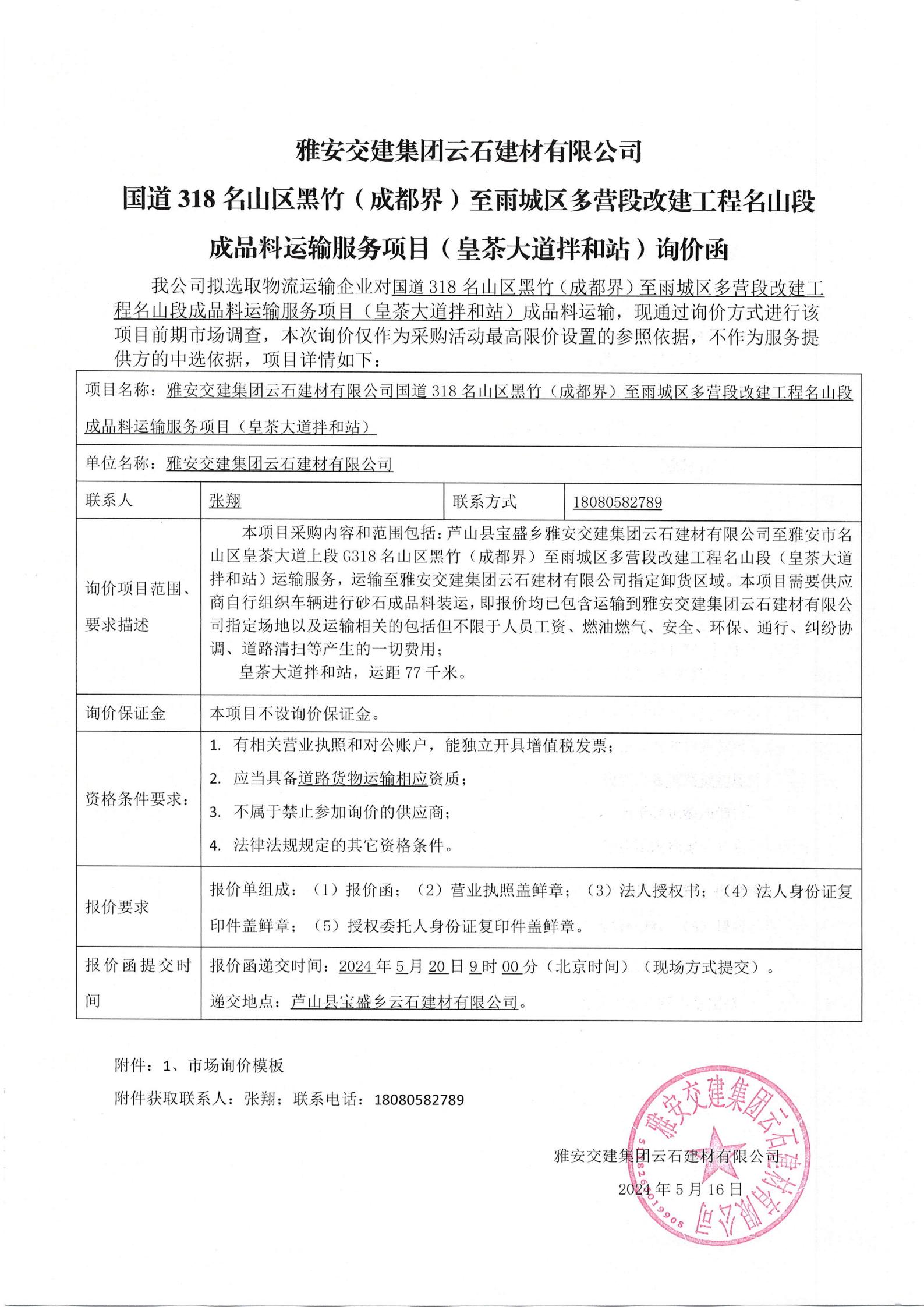雅安交建集團(tuán)云石建材有限公司國道318名山區(qū)黑竹(成都界)至雨城區(qū)多營段改建工程名山段成品料運(yùn)輸服務(wù)項(xiàng)目(皇茶大道拌和站)詢價(jià)函
