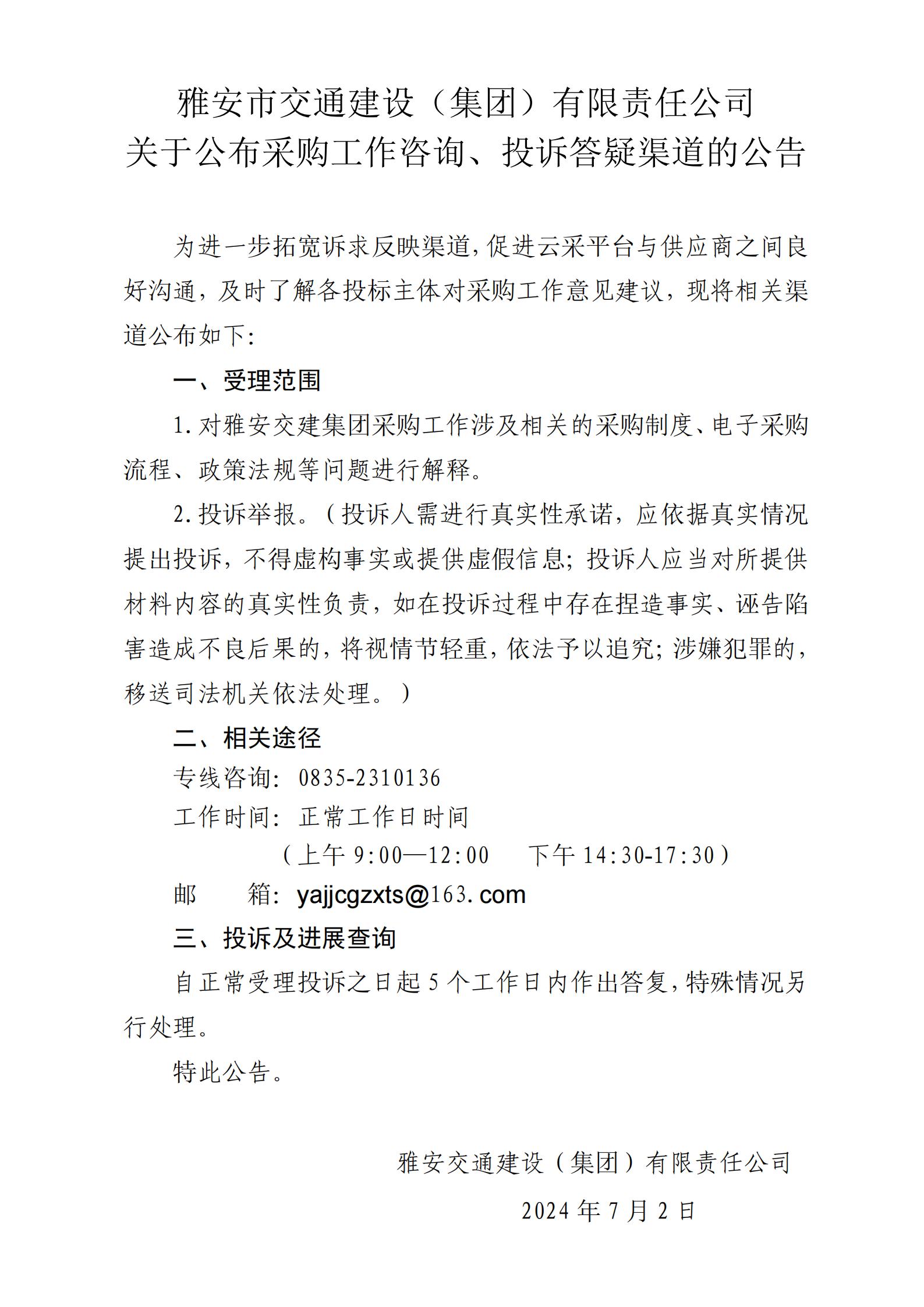 雅安市交通建設(shè)(集團(tuán))有限責(zé)任公司關(guān)于公布采購(gòu)工作咨詢、投訴答疑渠道的公告