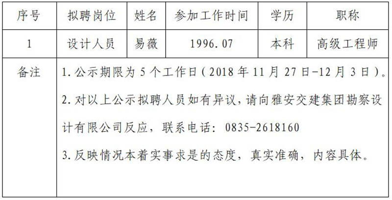雅安交建集團勘察設(shè)計有限公司擬聘用人員公示