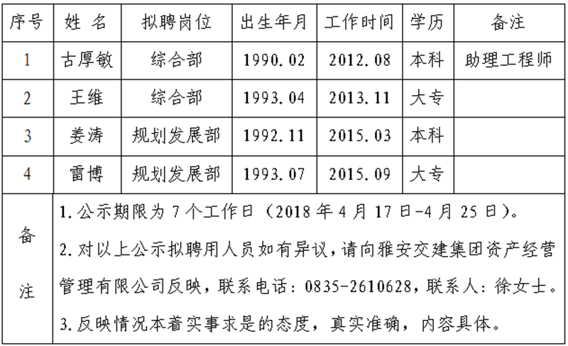 通過公開報名、資格審查、面試等程序,經雅安交建集團資產經營管理有限公司研究擇優(yōu)確定以下4名擬聘用人員,現(xiàn)公示名單如下: