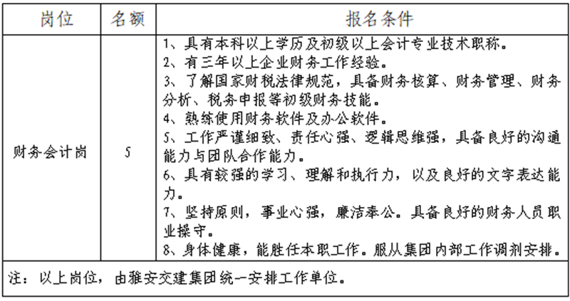 根據(jù)發(fā)展需要,決定面向社會(huì)公開招聘雅安市交通建設(shè)(集團(tuán))有限責(zé)任公司(以下簡稱“雅安交建集團(tuán)”)所屬子公司財(cái)務(wù)工作人員5名,現(xiàn)將有關(guān)事項(xiàng)公告如下: