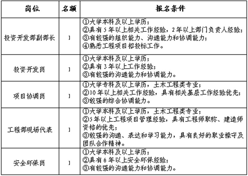 雅安交建集團(tuán)資產(chǎn)經(jīng)營管理有限公司是雅安市重點(diǎn)國有企業(yè)雅安市交建集團(tuán)下屬子公司,主要從事企業(yè)資產(chǎn)經(jīng)營管理;項(xiàng)目投資;土地整理等業(yè)務(wù)。根據(jù)公司發(fā)展需要,決定面向社會公開招聘5名工作人員,現(xiàn)將有關(guān)事項(xiàng)公告如下:
