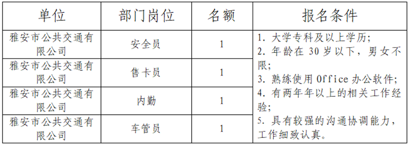雅安交建集團關(guān)于公開招聘所屬子公司工作人員的公告(公交公司)